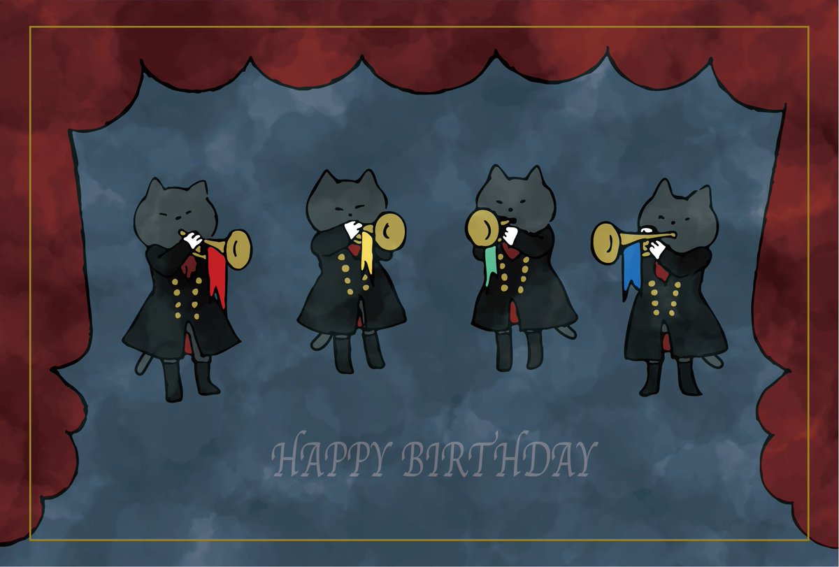 バースデーカードを作った。猫のトランペット四重奏。ファンファーレ。 かっこ良くしたくてデジタルで仕上げてみたけどアナログでも仕上げよう。 #イラスト #絵 #猫 #トランペット