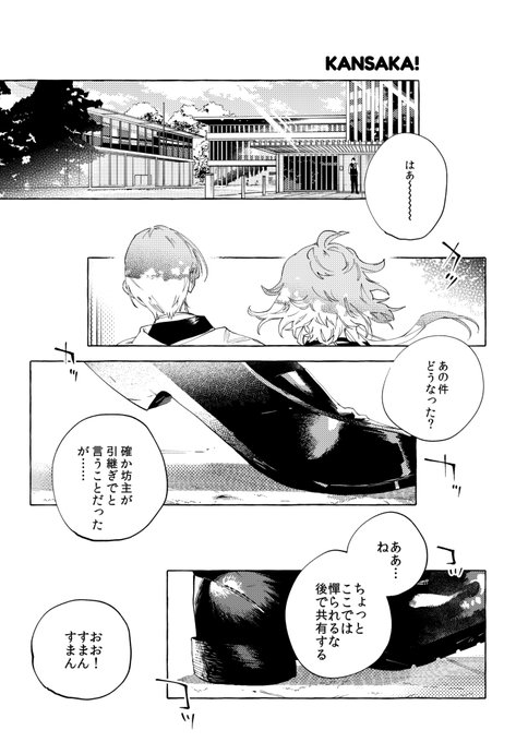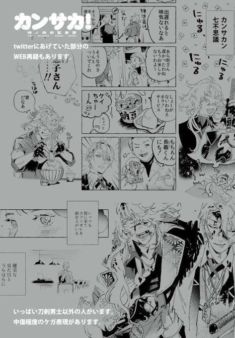 10/16 閃華の刻38 西1ア27b【UGUMOG】にて 「カンサカ!」A5/48P/600円 ●本文サンプルです。 ●WEB再録も含みます。 ●刀剣男士以外の人間いっぱいいます。 ●中傷程度のケガ表現があります。(1/2) twitter.com/0117_cel/statu…