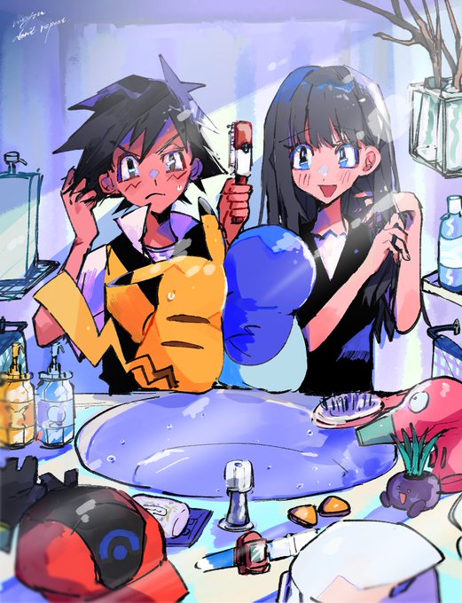 8 36 #ポケモントレーナー版深夜の真剣お絵描き60分一本勝負 お題:川が似合うと思うトレーナー クリスちゃんとアリゲイツとマリルです💙 22/10/15 23:00