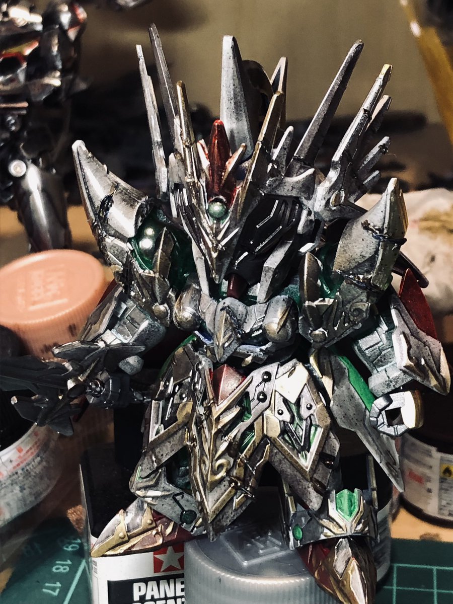 ひっさしぶりに撮影ブースでの撮影もしたのでナイトとツーショット😁 相変わらずごちゃごちゃしてんなー 頑張って作ってたのでたくさんの方に観てもらいたいです😚 #ガンプラ好きな人と繋がりたい #ガンプラの画像貼るとRTされると聞いて #SDガンダムワールドヒーローズ