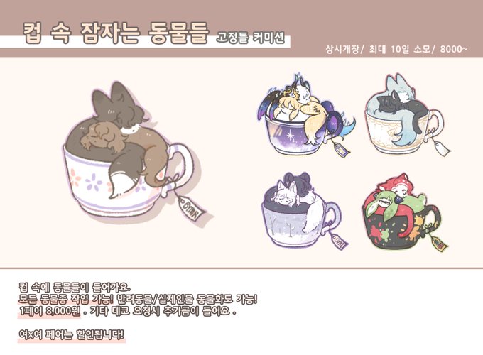[컵 속 잠자는 동물들] 고정틀 동물화 커미션이에요. 1페어 8,000원부터 시작합니다. 기한은 보통 10일가량 소모되어요. 연성교환으로도 작업 가능합니다! ><! 상세사항은 페이지 확인해주시면 OK! ehn-mission.tistory.com/31