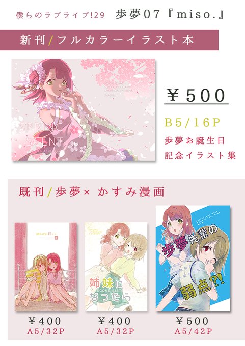 僕ラブ29、スペース「歩夢07」 お品書きと新刊サンプルです。 新刊は歩夢フルカラーイラスト本、既刊はあゆかす漫画です。 よろしくお願いします🥰