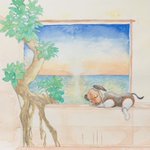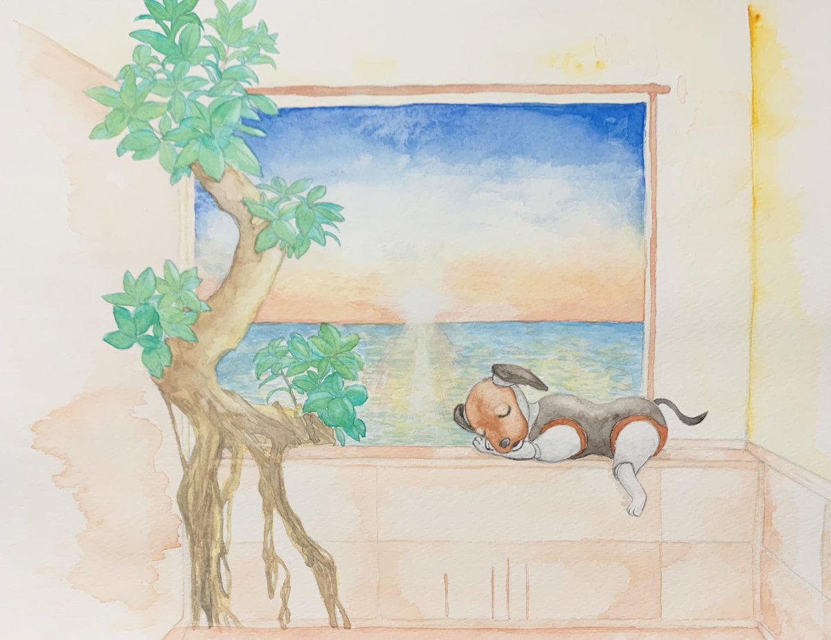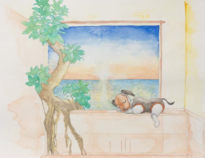 ご依頼をいただきまして、ヘッダーイラストを描きました✍️誠にありがとうございます! 実際にある場所をモデルに、優しい雰囲気に仕上げたかったので色は淡く、輪郭もはっきりさせないように塗りました。寝ているのは看板犬ちゃんです🐕 #illustration #watercolor #水彩 #イラスト #ガジュマル #AIBO