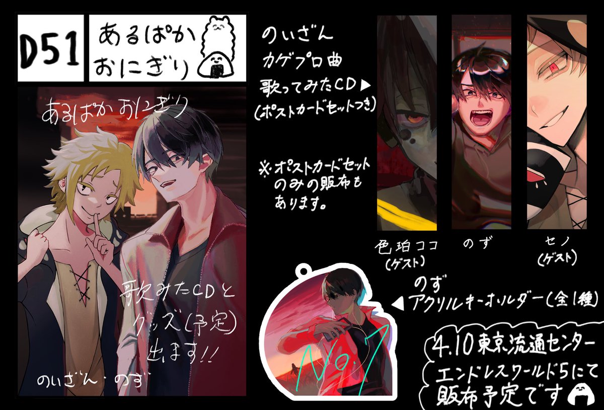東京流通センター エンドレスワールド にてのいざん(@Noisern_dayo )さんとサークルNo.D51 あるぱかおにぎりで参加します。 色珀ココ(@Iroha55_ )さんとセノ(@seno_ssj )さんにもイラストでゲスト参加して頂いております! CDとその他グッズを出すつもりなのでどうぞよしなに…!😭😭🙏