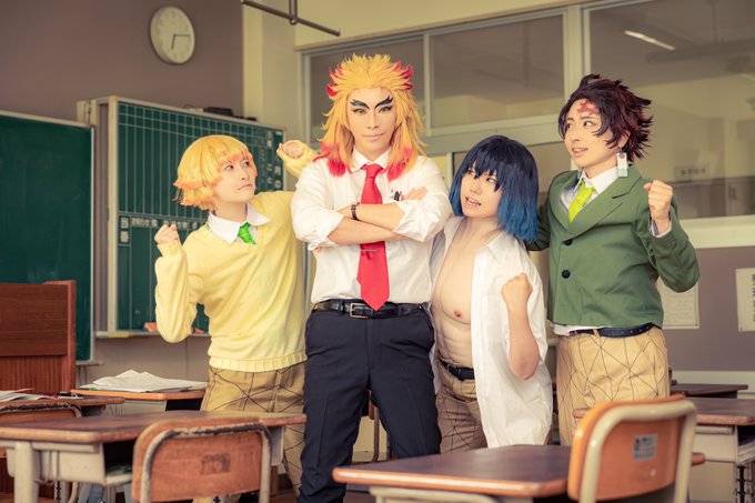 ⚠️cos⚠️ Kmt 👹🏫バージョン 「「「 兄貴ィ !!!」」」 🔥……汐 🎴……麦田 ⚡️……佐々 🐗……さくら 📸くお@kuoooooosbckn