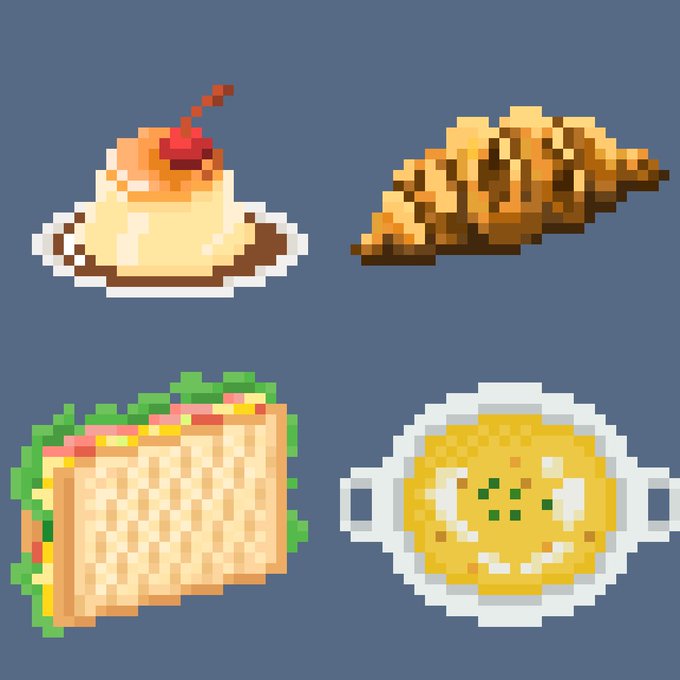 食べ物打ってたやつ2こあったからもう2個さらに打った〜 お腹空いてきた #ドット絵 #potipoti #イラスト #pixelart
