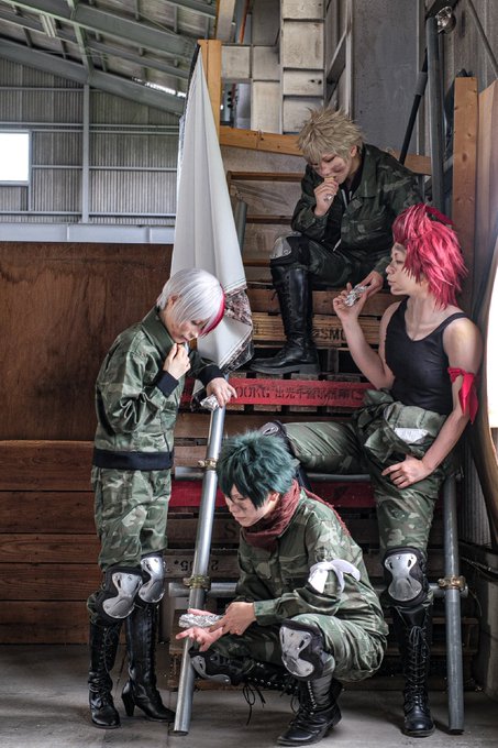 7 21 cosplay【MHA】アーミー衣装 〘 休息 〙 緑谷出久:すてぃるさん 爆豪勝己:刻.さん 轟焦凍:瑠祢さん 切島鋭児郎:UTA photo:海さん(@toushi_dinosaur) studio:ロケーションfsさん(@Location_fs) 23/06/25 12:59