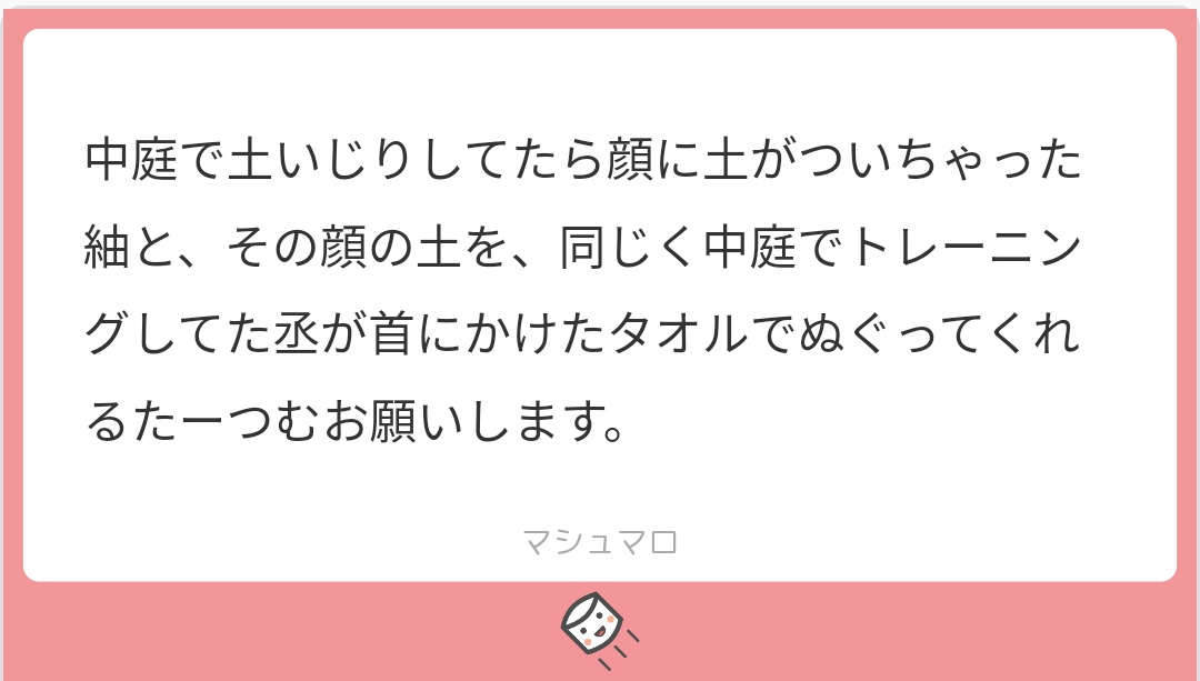 10 28 両片想い丞紬でリクエストいただきました💚💙…が謎シチュにwしかも無自覚から自覚したような感じになってしまってお題に沿ってない😇 エアスケブでした、ありがとうございました! #たーつむエアプチ 21/03/03 00:45
