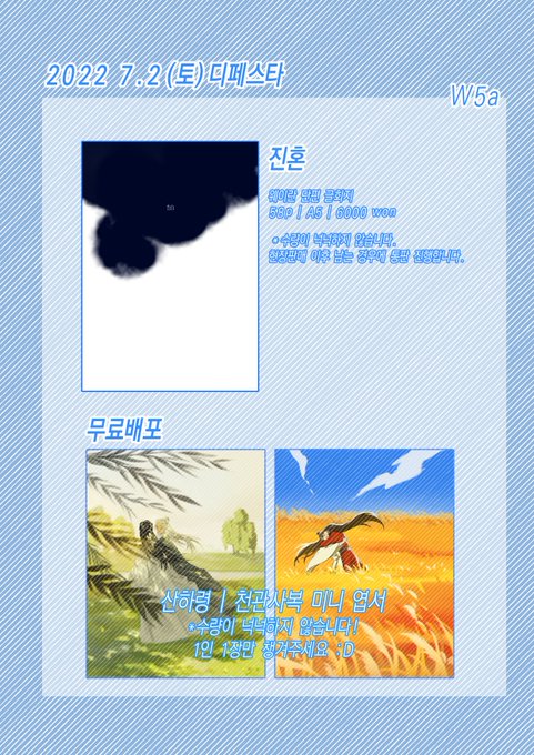 7월 2일 (토) 디페스타 인포입니다 웨이란 단편 글회지 샘플은 이쪽에서 확인하실 수 있습니다 ▶️ posty.pe/nazwsw 회지/엽서 모두 수량이 넉넉하지 않으니 참고해주세요! 부스는 2시~3시쯤 접을 예정입니다!