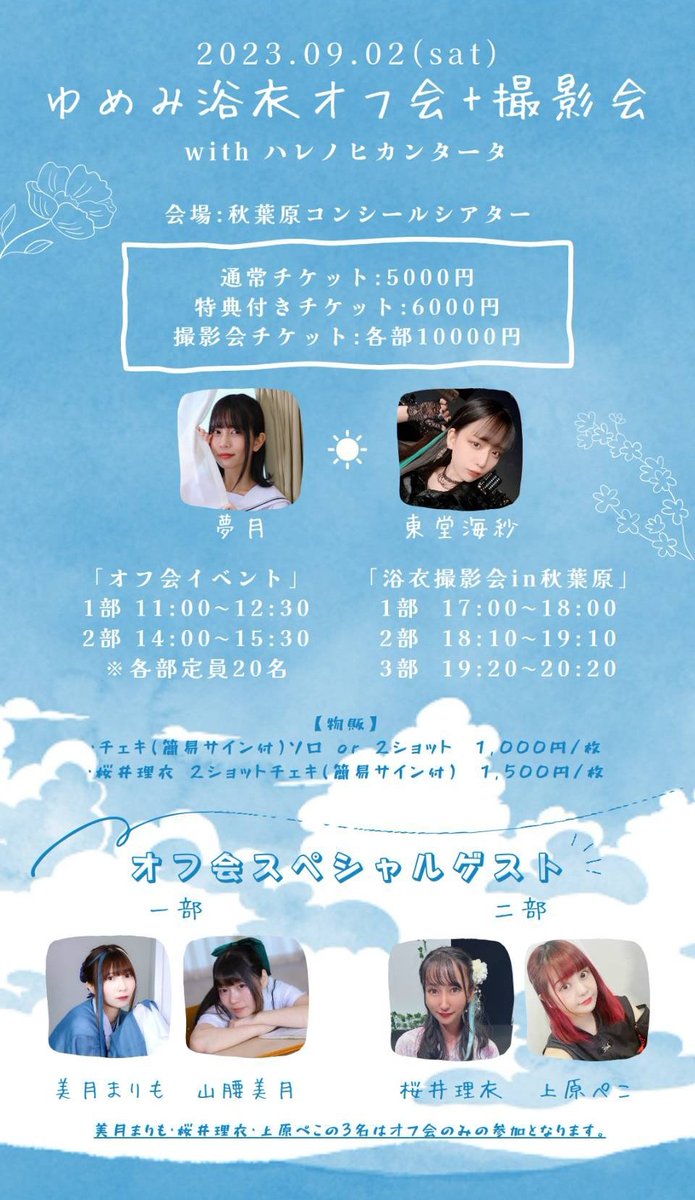 【お知らせ🪼】 「ゆめみ浴衣オフ会+撮影会 with ハレノヒカンタータ 」 各部スペシャルゲストをお招きして、ハレノヒカンタータプチオフ会を開催致します!ライブにトークに盛りだくさん! すぐ満席になっちゃうかも…😌☝️ 【予約】※8/8(火)21:00~受付開始 passmarket.yahoo.co.jp/event/show/det…