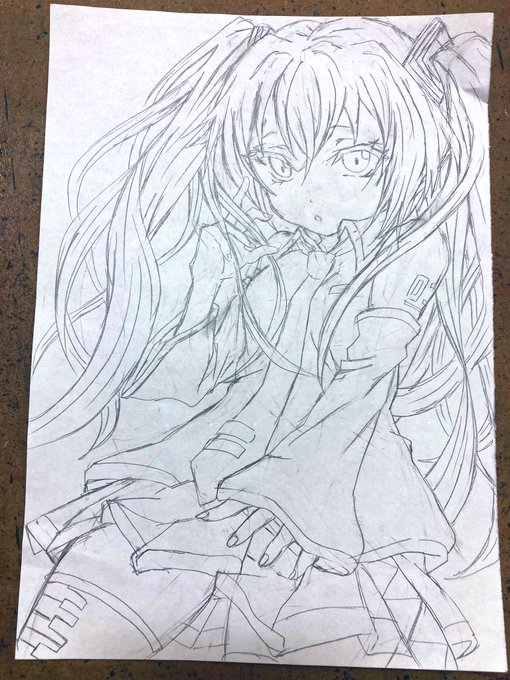 今描いてるミクさん。左右反転して描いてるんだけど、そのほうが可愛い気がしたんだ #イラスト #初音ミクイラスト #アナログ絵