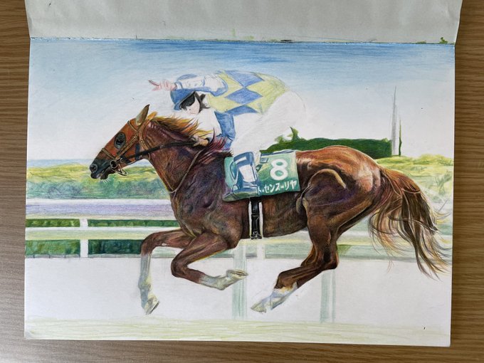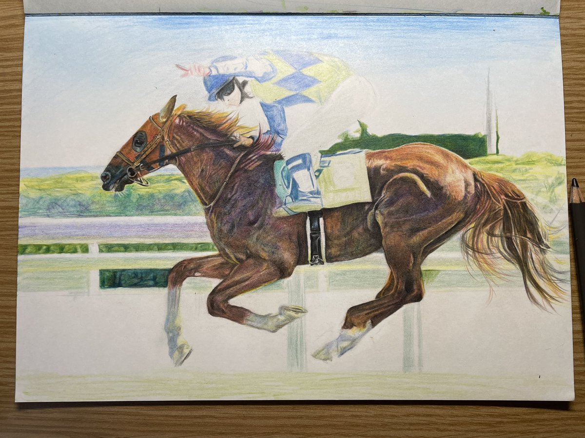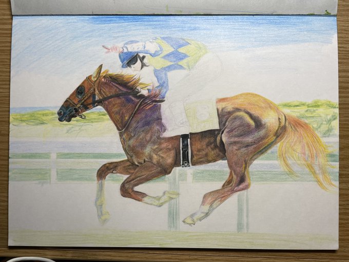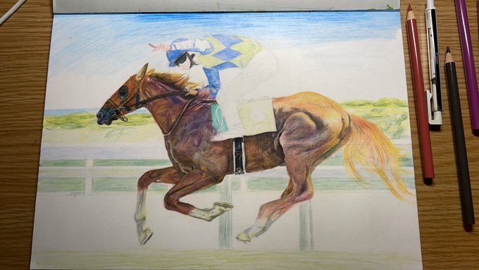 今日はここまで。 走るのが好きでたまらない様子、騎手さんとの信頼や、育ててくれた方や周りの方のことも当然分かっている。 すべての相性が完璧に合って充実して走っている。 完成は遠いけど次回名前描きます✨ #分かる方いますか #絵描きさんと繫がりたい #札幌Twitter会 #馬主 #競馬