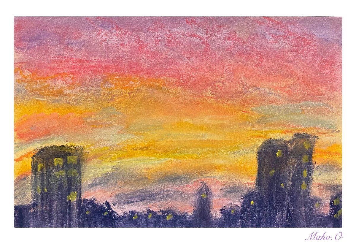 いつかの夏至、会社の屋上から見た夕焼け空がきれいでした。#絵画 #イラスト