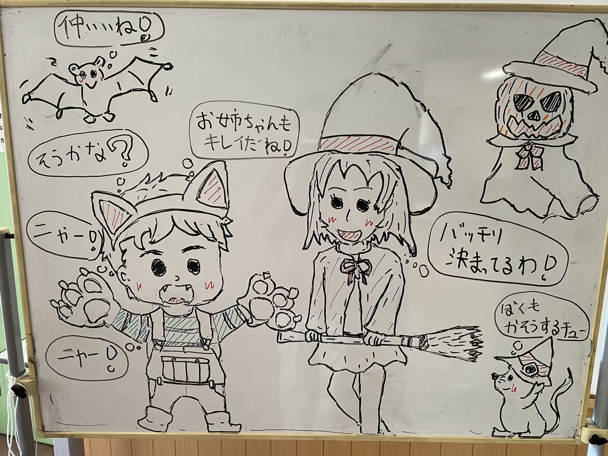 明日はハロウィン🎃 とある姉弟のやりとり…かな🍀 明日へ続く‼️ #イラスト #絵 #介護 #ホワイトボード #ハロウィン