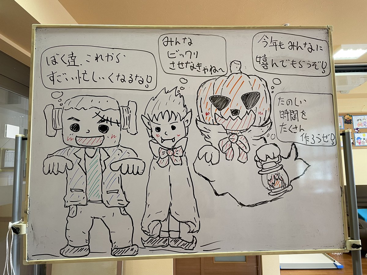 今日はハロウィンの 主役のみんなが集まって… 何やらお話ししてるみたい🍀 フランケンシュタインくん ドラキュラくん ジャックくん! 今年は忙しくなるといいね(*´ω`*) #イラスト #絵 #介護 #ホワイトボード #ハロウィン