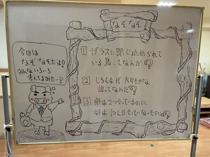 こんにちは(*^^*) 今日はトン吉くん なぞなぞを考えてくれたみたい‼️ みんないろいろ考えて きているみたいですね〜 夕方頃に答え合わせしてみます(^-^*) #イラスト #絵 #ホワイトボード #かいご