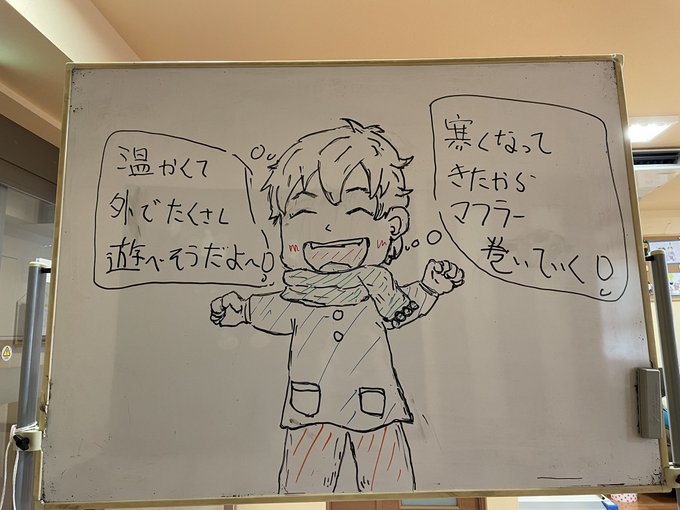 マフラーをしてる理由… それは早くしてみたくなりますね‼️ あと、1人ぐらいいましたよね 寒くない‼️って半袖、半ズボンの人 昨日は腕が以上に短かったので 今日は短くならないように笑 #イラスト #絵 #ホワイトボード #介護