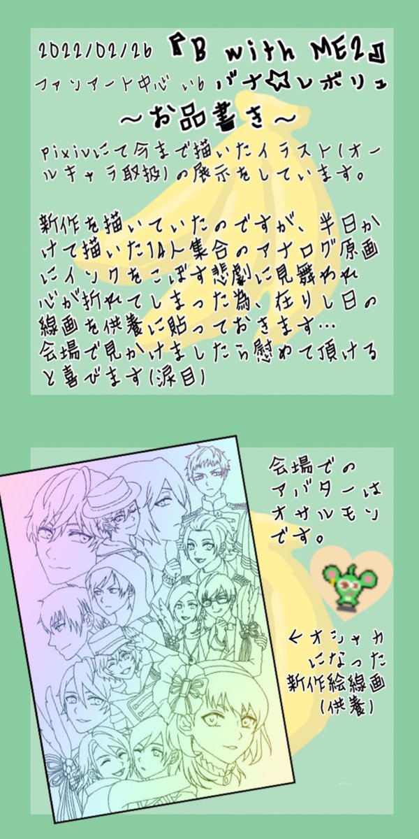 #BwM0226 #BwM2お品書き 用意してた新作が駄目になってしまって心が折れてしまいました… 見る専に徹して皆さんの作品で癒されようと思います🥲 過去絵しかないですが前回のオンリーから少しは数増えてるので宜しければ覗いていって下さい🙇♀️ twitter.com/0ukyou0/status…
