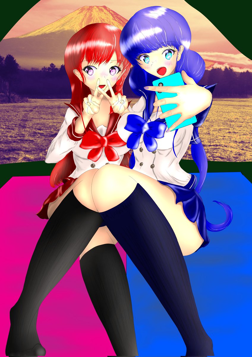 「ハイチーズ」 富士山をバックにラブラブな名ちゃんと鳴海ちゃん! 名ちゃんは照れちゃっている( ´,,•ω•,,`)♡ レイアウトが見えてきたので!ここから本気出して頑張る!! #絵描きさんと繋がりたい #イラスト好きな人と繋がりたい #キャンプ好きな人と繋がりたい #百合 #オリキャラ