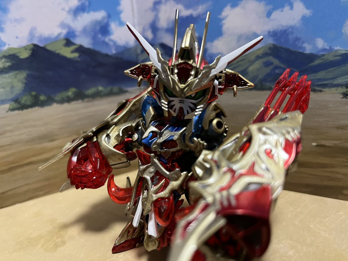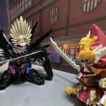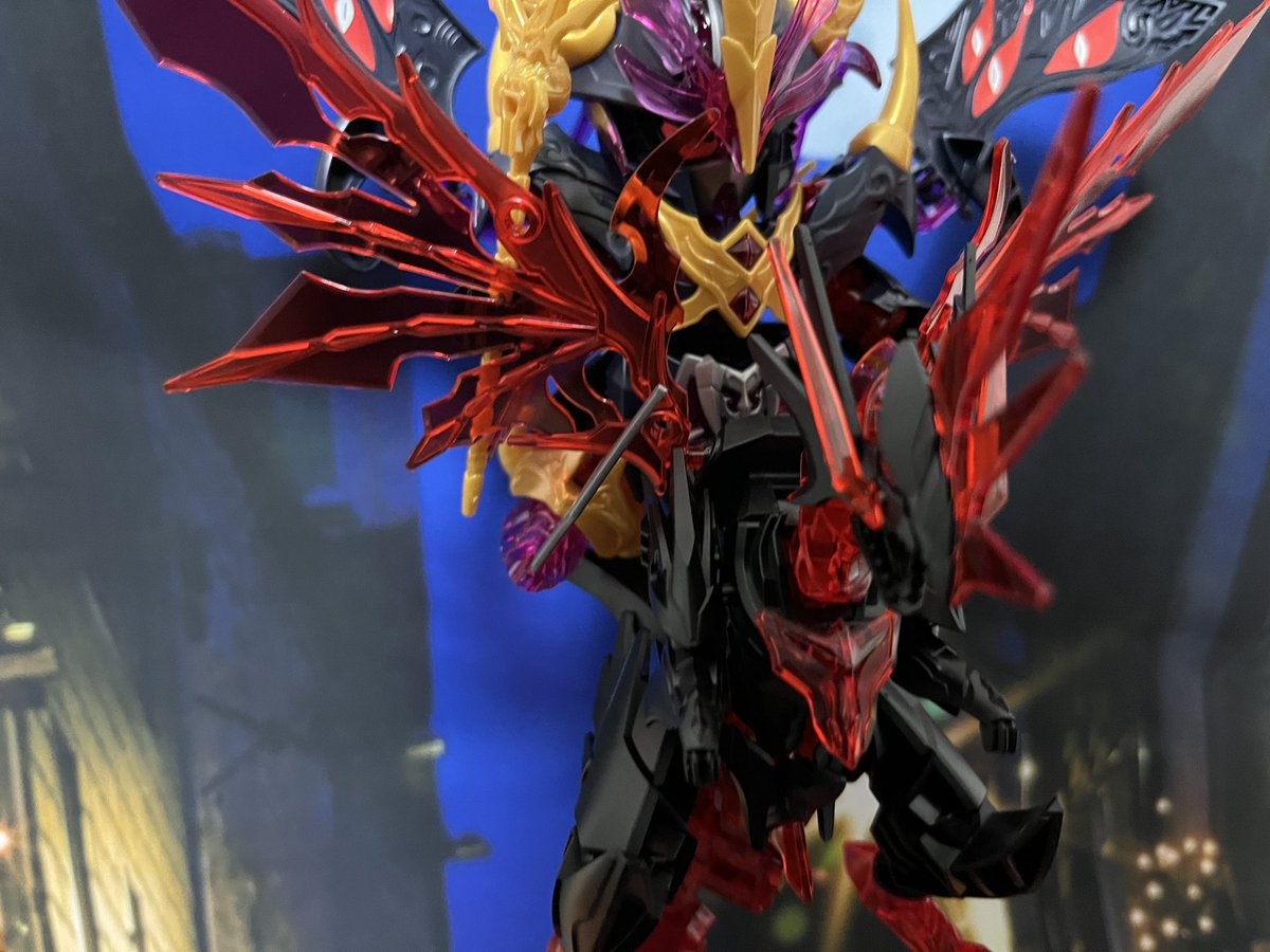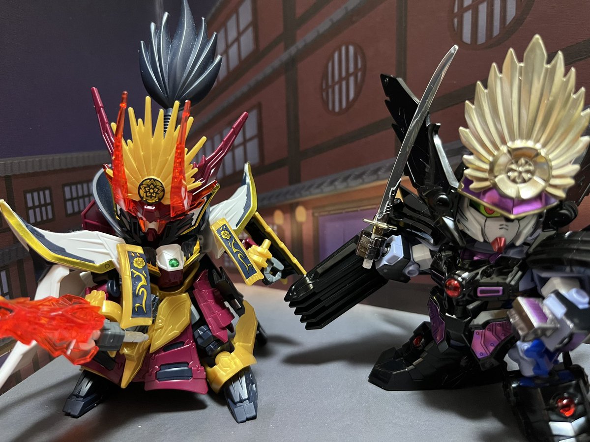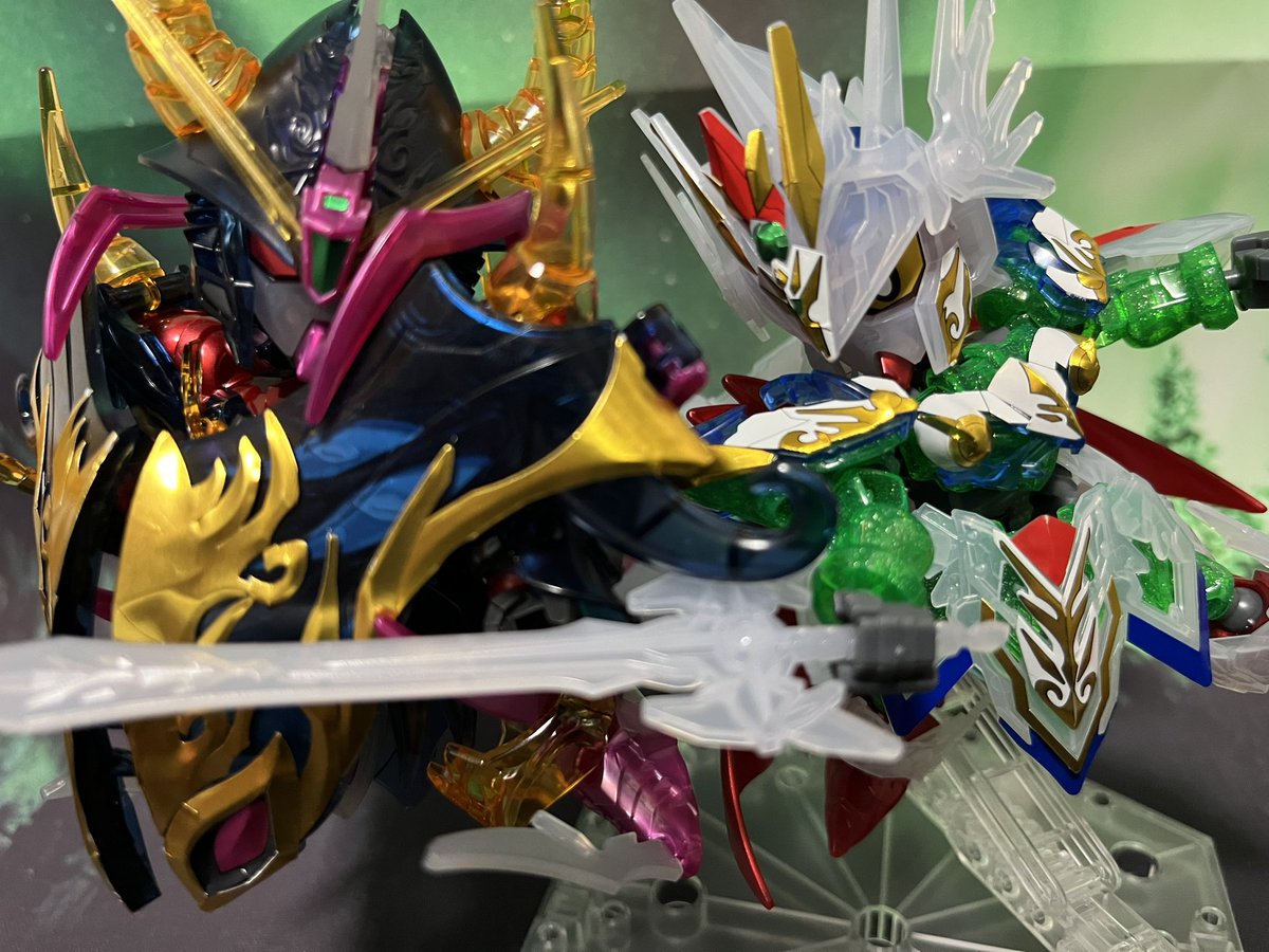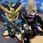 #SDガンダムワールドヒーローズ #悟空インパルスガンダム #ガンプラ ダークバージョンの猪八戒シルエット。こちらで使うパーツもクリアパーツは赤から紫、金の整形パーツもグロスインジェクションの黒になってますね。猪八戒シルエットの時点でも2体並べると使ってる背景ボードが狭く感じます。