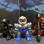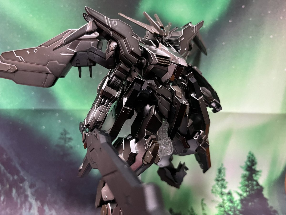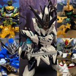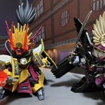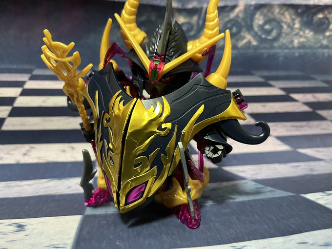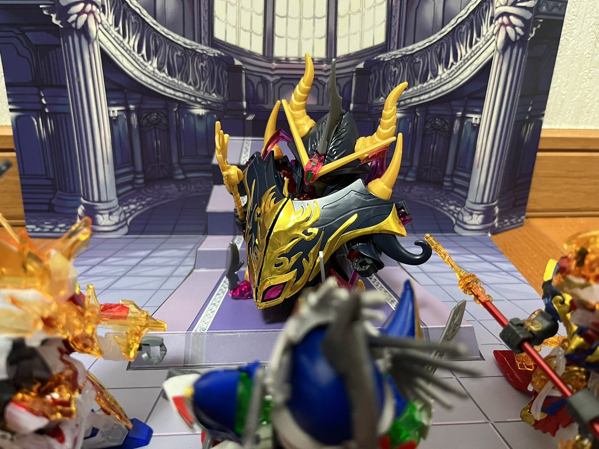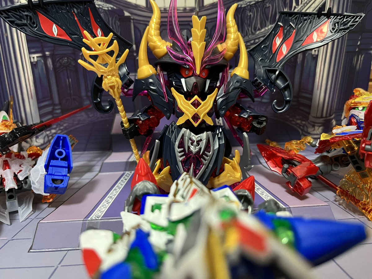 #SDガンダムワールドヒーローズ #悟空インパルスガンダム #ガンプラ ダークバージョンの猪八戒シルエット。こちらで使うパーツもクリアパーツは赤から紫、金の整形パーツもグロスインジェクションの黒になってますね。猪八戒シルエットの時点でも2体並べると使ってる背景ボードが狭く感じます。