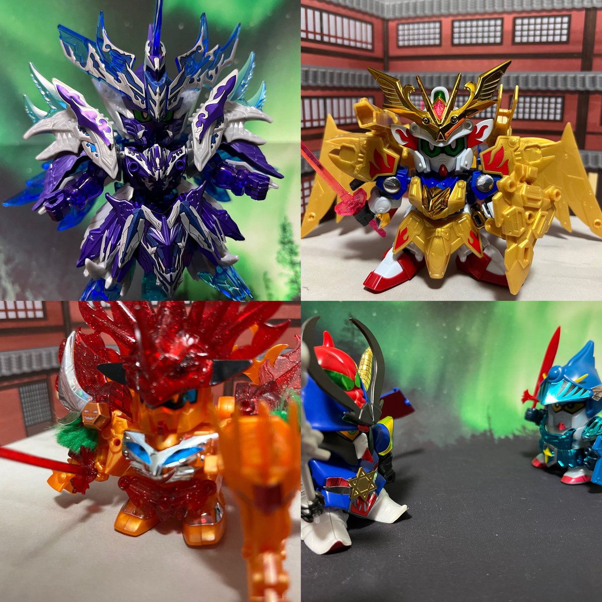 #今月作ったプラモ晒そうぜ 悟空インパルスガンダムDXセットダークVer.、闇堕ち前の才蔵、レジェンドBBでナイト、バーサルナイト、スペリオルドラゴン三位一体セットの劉備、関羽、張飛 、張郃ザクⅢ、袁術ズサ 、劉封ガンダム白龍ガンダムです。 塗装したのは闇堕ち前の才蔵と劉封と白龍の3つです。