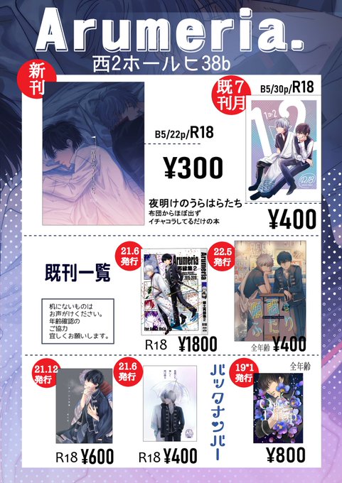 10月16日かぶき町よろしくお願いします ◆新刊サンプル◆ pixiv.net/artworks/10190… ◆通販◆ melonbooks.co.jp/fromagee/detai… お品書きは画像の通りです〜↓