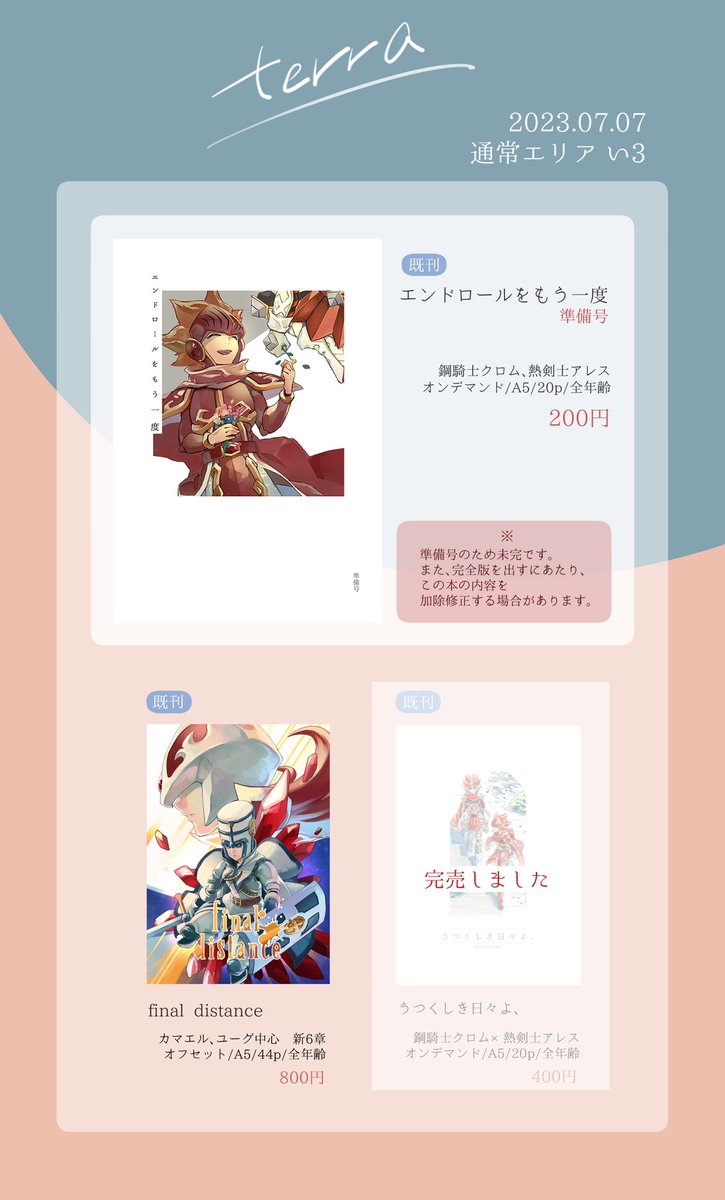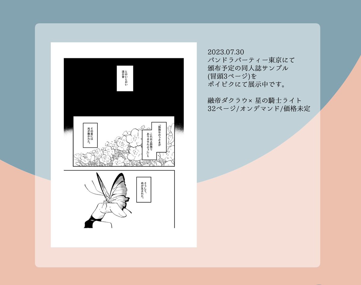 #パンドラパーティーweb 7/7~8開催【パンドラパーティーweb】お品書きです。 【通常エリア:い3】にスペースいただきました。 新規頒布物に大判ポストカードあります。 また、7月30日開催【パンドラパーティー東京】にて頒布予定の新刊サンプルをポイピクで展示します。 よろしくお願い致します!