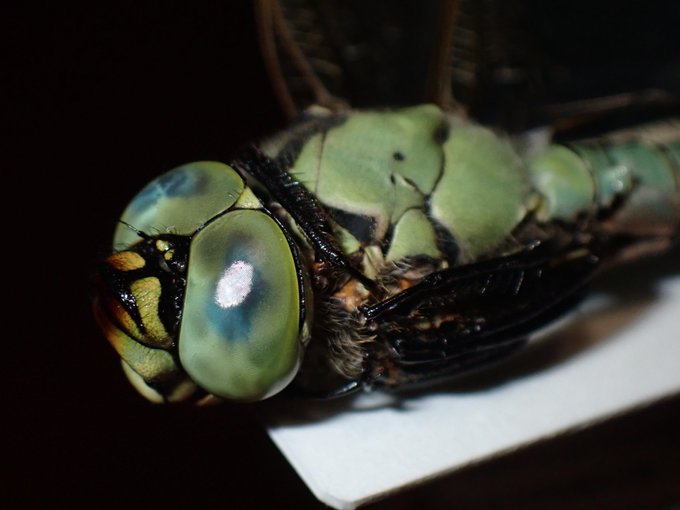 32 275 アオヤンマ。伝統的な方法では色彩が失われるとされてきたトンボの標本。そのブラッシュアップ臨む、なべっちょ君(@CT817815 )による標本。制作には専門知識と専用機材が必要で、簡単には真似できないが、彼の技術をもって博物館展示用トンボ標本の複眼が輝く日も来るに違いない。 #インセクトフェア 22/09/23 17:19