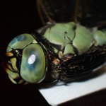 アオヤンマ。伝統的な方法では色彩が失われるとされてきたトンボの標本。そのブラッシュアップ臨む、なべっちょ君(@CT817815 )による標本。制作には専門知識と専用機材が必要で、簡単には真似できないが、彼の技術をもって博物館展示用トンボ標本の複眼が輝く日も来るに違いない。 #インセクトフェア