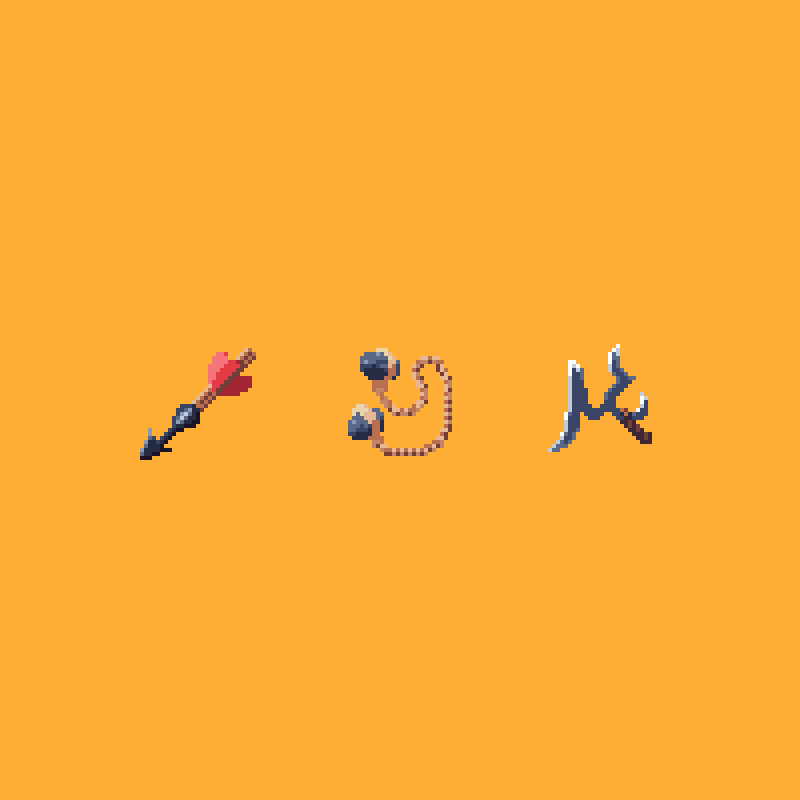 Three #ThrownWeapons, a Plumbata,a Bolas,and a Mambele for today's @Pixel_Dailies theme. #pixel_dailies #ドット絵 #pixelart #pixelartist #pixelartwork