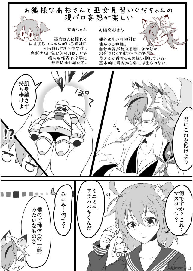 48 250 JBFで配布した高ぐだ♀無配です🦊 お狐様な高杉さんと巫女見習いな学生ぐだちゃんの突発漫画 23/07/01 13:36