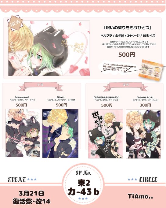 🌷3月21日 お品書き🌷 復活祭・改14のお品書きです。 【東2カ43b】におります~ ベルフラ準新刊サンプルは引用先にあります。無配は間に合ったら何かペーパーを出したい……よければお立ち寄りください! #復活祭お品書き twitter.com/0o__myon__o0/s…