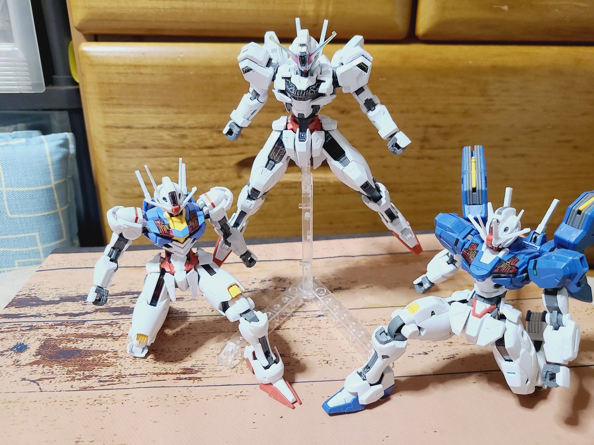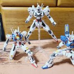 エアリアル、改修型、キャリバーン、3機並べれて嬉しい(*´ω`*) キャリバーンも出来るけど、膝たちのポーズできるの良いよね☺️ エスカッシャンをキャリバーンに付けてる状態もかっこいい(*ノωノ)#ガンプラ好きな人たちと繋がりたい #ガンプラの画像を貼るとRTされると聞いて #ガンプラ