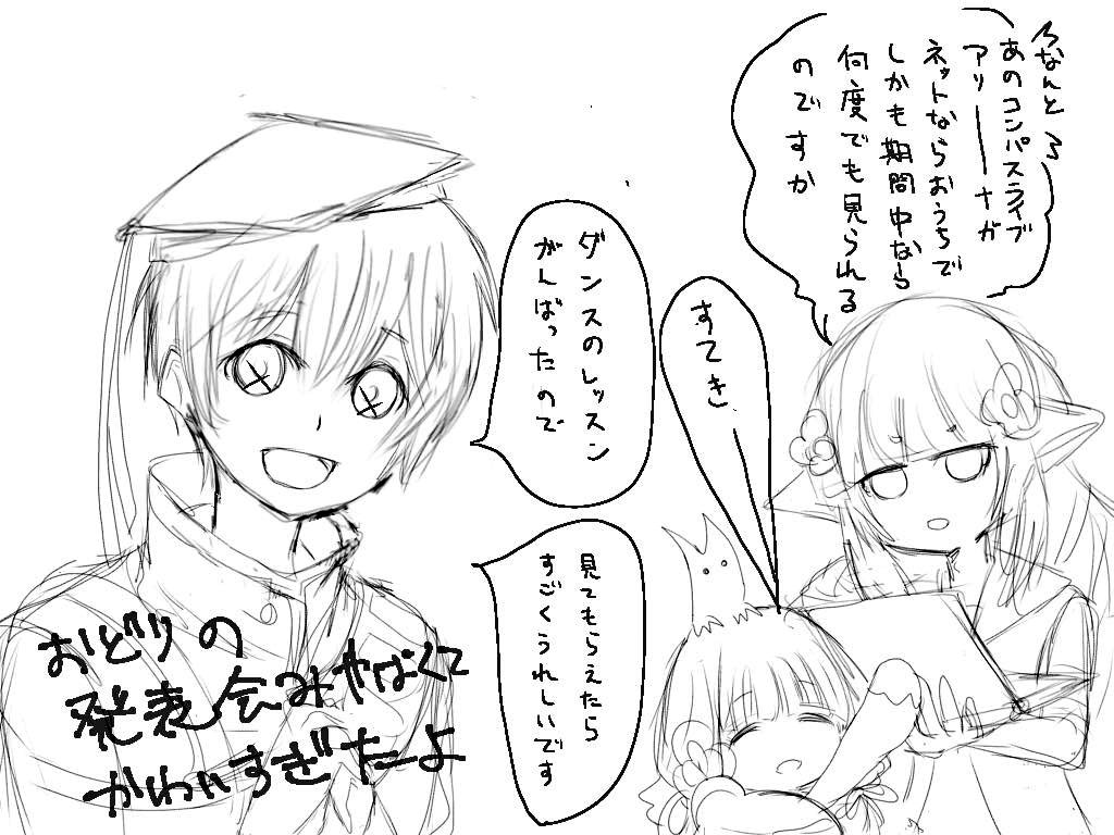 ネタバレにならないライアリの感想とりいそぎ汚い。おちびちゃんたちかわいすぎて何度でも見たいです……毎日の糧にしたい。ちなみにネットチケット買いました、まかせて。ユーリエフ推しは見ないと後悔するだけなので買ってください絶対買っ #コンパスお絵描き #コンパスライブアリーナ #コンパス