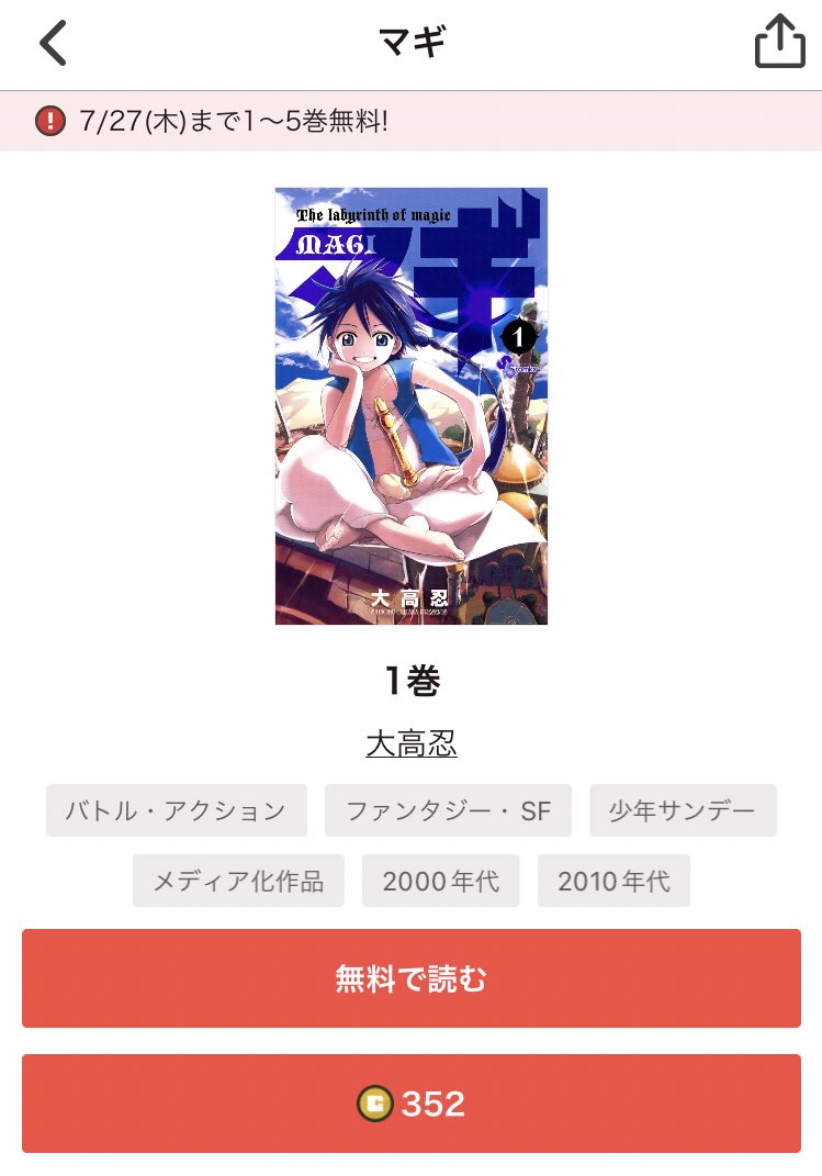 サンデーのアプリで全話公開中のマギですが1〜5巻のガチ無料が今日までで恐らく明日から6〜10巻に切り替わるのでみんな今夜中に5巻まで読んどいて
