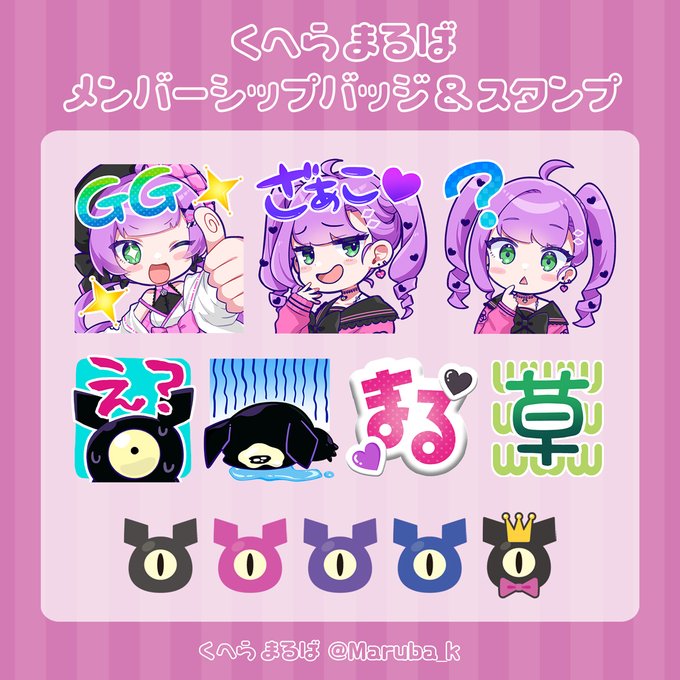 💜works Vtuber くへらまるばさん(@ Maruba_k)メンバーシップバッジ&スタンプ描かせていただきました〜! 賑やかスタンプいっぱい使ってください〜🎀