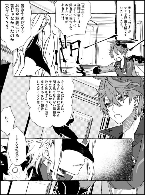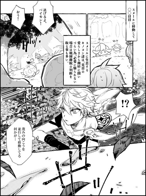 397 3105 挨拶を暴力で済ませるタルと、それに普通に剣で対応できる旅人と、モンドに散歩で行くんだからきっとスメールにも散歩で来てる筈と信じて疑わない先生が描きたかっただけの特にオチのない漫画。 22/09/22 03:10