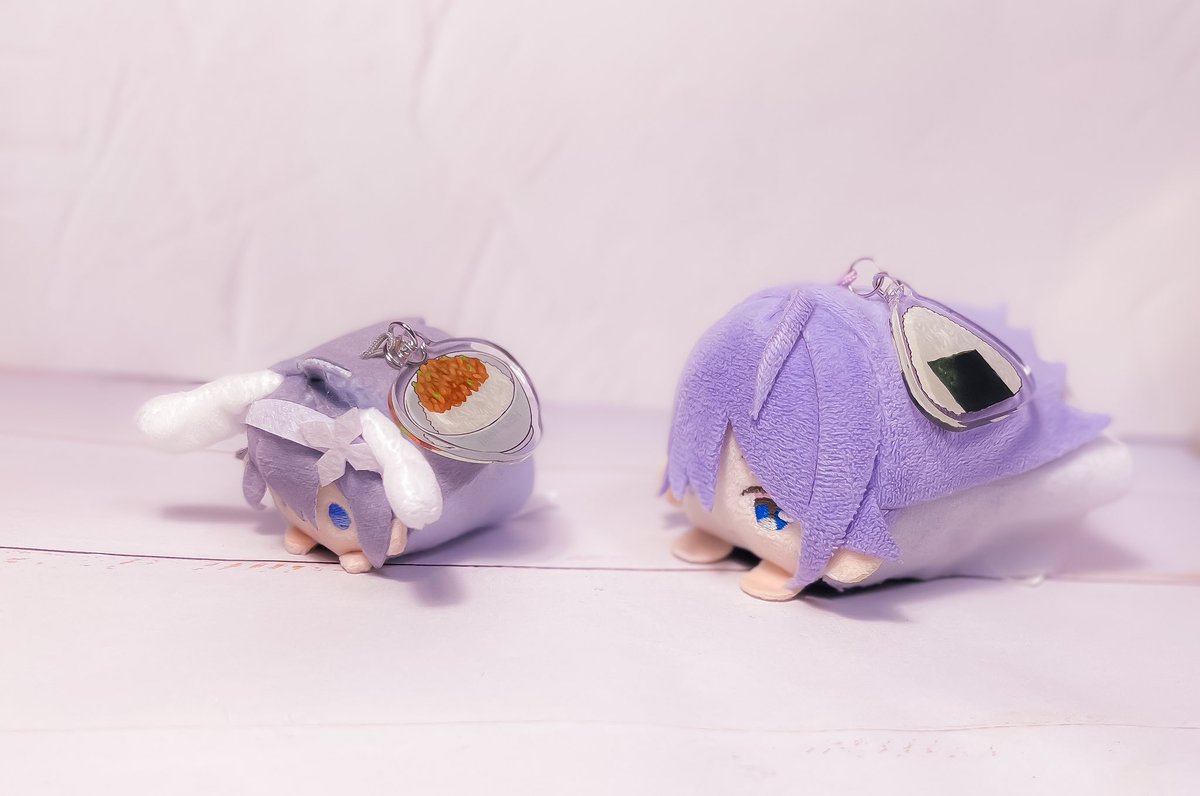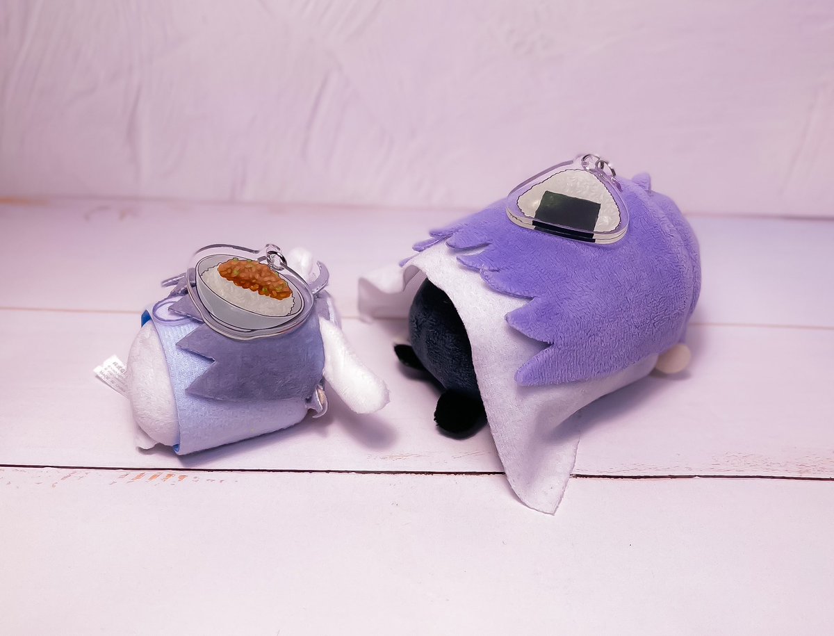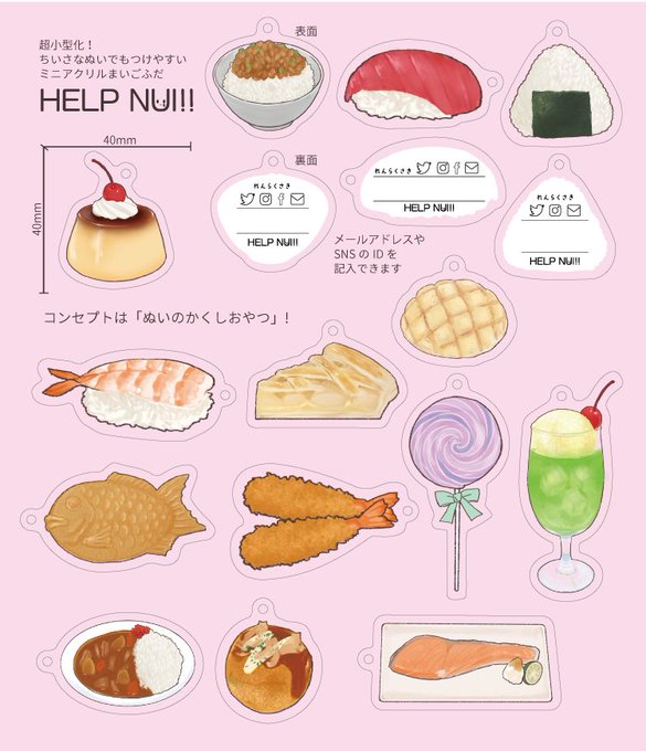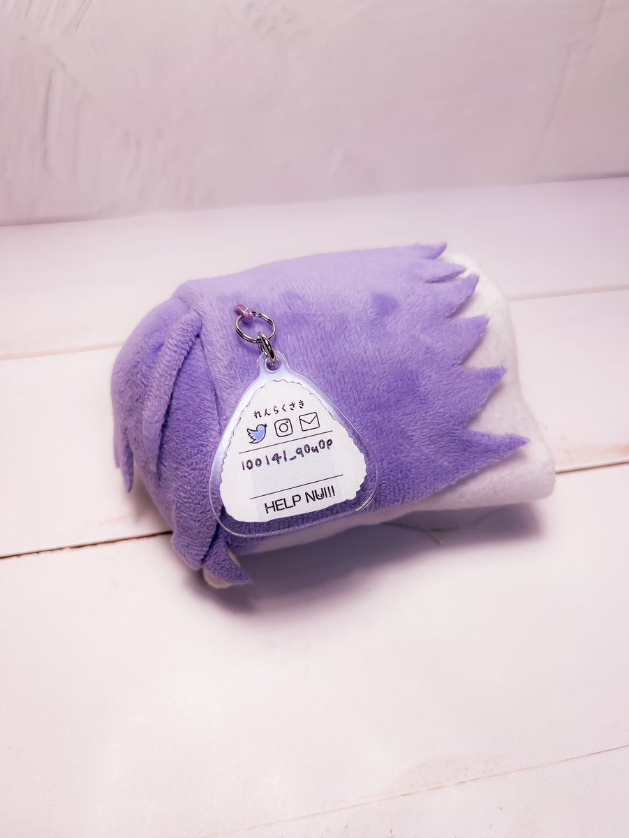 46 85 「HELP NUI!! 」実物サンプルです🍙実際もちに付けるとこんな感じです! お弁当持ってるみたいですね😌 🔗金具は外れにくいようにカニカンではなく二重リングになっています ✍裏側に油性の名前ペンで記入できます!SNSアイコンは丸をつけても色を塗っても🙆(サンプルはコピックで塗りました) 23/04/22 20:59