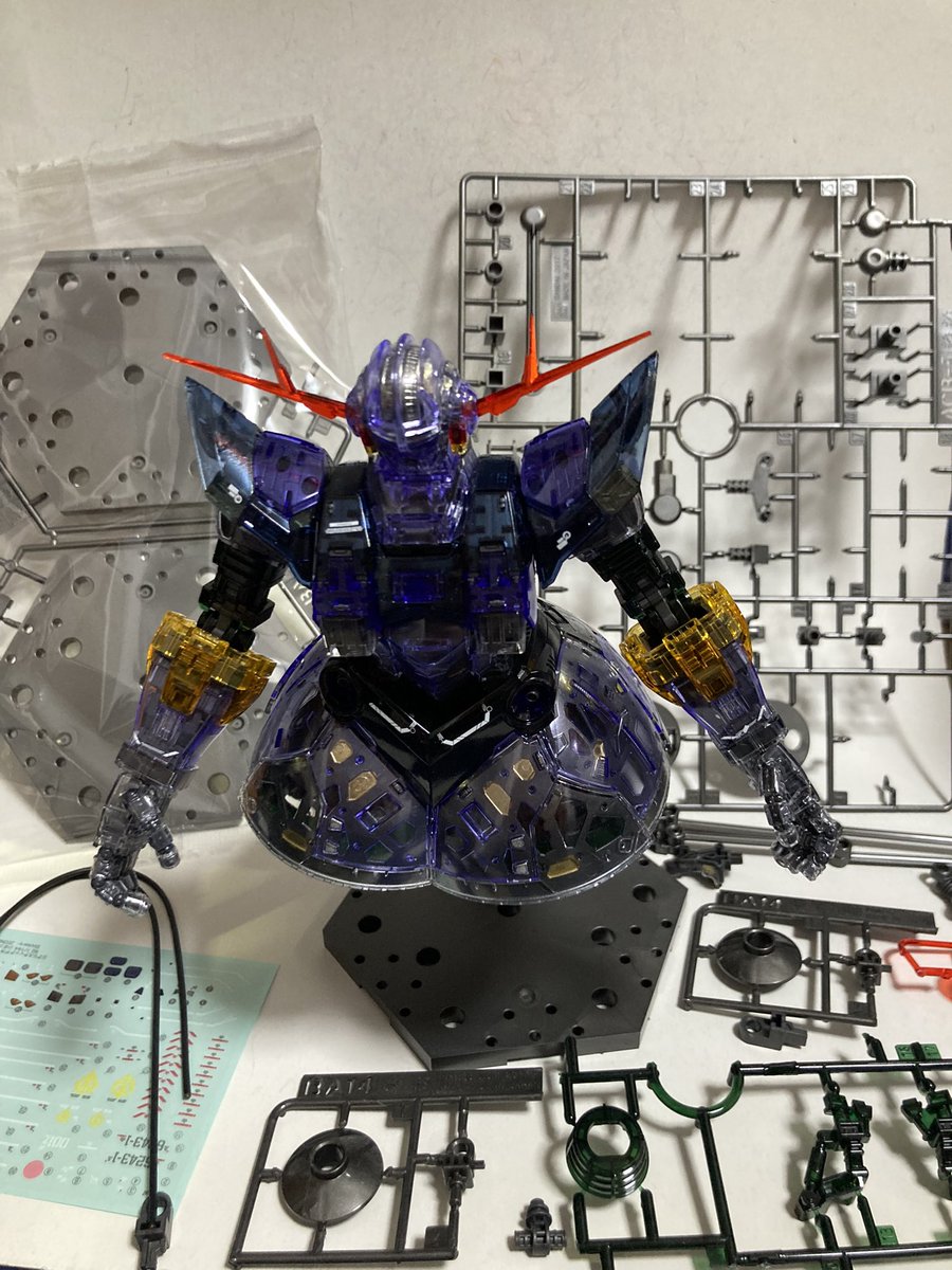 RGジオング完成〜 今回外装には光沢を拭いて内部フレームには部分塗装を施してクリアーを生かした制作をしてみました 1部パーツが余剰となっています台座の配置は好みで3枚選ぶことができるので自分は1枚配置にしました〜 #ガンプラ #ガンプラプチレビュー