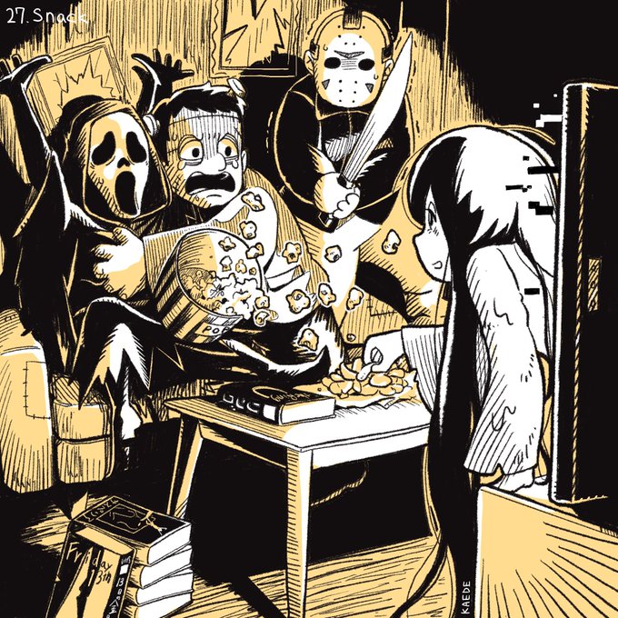4 14 #inktober2022 Day27: Snack / スナック ドキッ💘怪物だらけのホラー映画鑑賞会🎉{(首)ポロリもあるよ💓} #Inktoberday27 #inktober 22/10/27 00:03