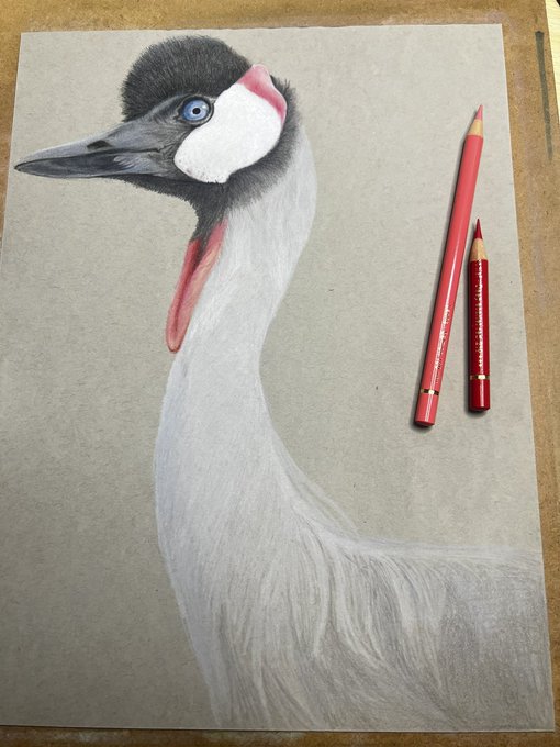 新しい紙をやっと使ってるけど、 中々いい😆✨ #色鉛筆 #ホオジロカンムリヅル