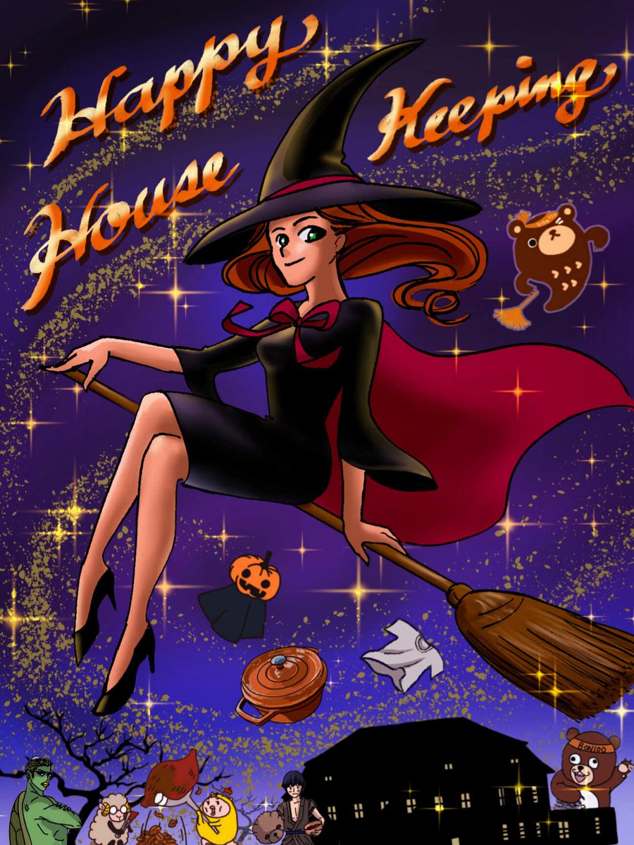 #ハロウィンイラスト 家の片付け大体終了しました🗃️📚🗄️ちちんぷぃぷぃ〜✨🧹✨🧙🏻♀️で家事が出来たらいいんだけどなぁ😂 フォロワッサマのイラストお借りしました。今年は皆様のお陰で賑やかで楽しいハロウィンです🎃👻🥳🎶