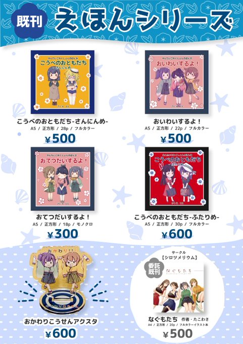 既刊&委託分のお品書きができました!絵本シリーズの既刊とアクスタ+たこわささん(@tkws_srtm )のイラスト本の既刊の委託あります。よろしくお願いしますね そしてこの夏感がかわいいお品書きはたこわささんにデザインして頂きましたー!☺️✨(大感謝) twitter.com/1010crannull/s…