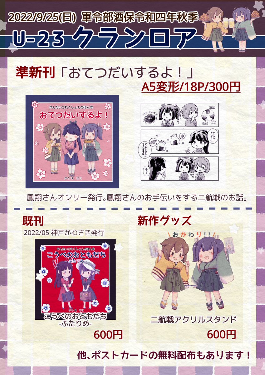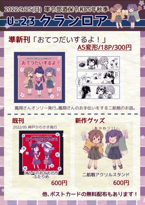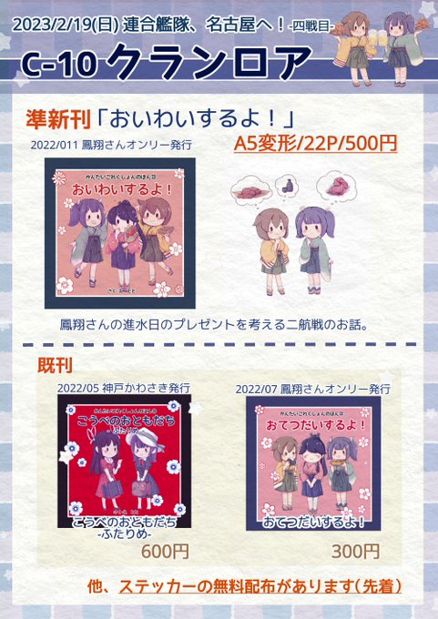 艦隊名古屋4の個人分のお品書きです。新刊は合同誌に全力を振ってるので既刊のみですが、鳳翔さんオンリーの既刊2冊は名古屋は初頒布です。あと、小さいステッカー的な物(絵柄は2枚目の画像)を無料配布します。よろしくお願いしますー #艦隊名古屋 #ふゆにこ twitter.com/1010CrannUll/s…