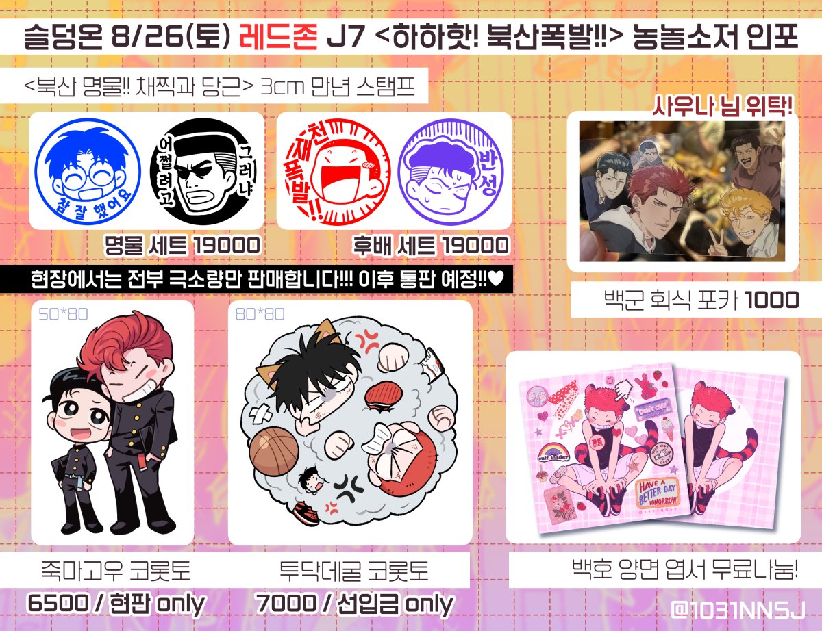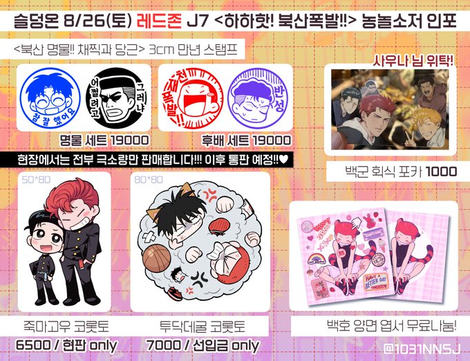 슬덩온 토요일 ★레드존!! J7★ 도장 굿즈 선입금 받습니다! 행사 전까지 수령해야해서! 소량만... 오늘 저녁 6시까지 빠짝 받아볼게요....!! 현장판매는 극소량...... 또는 없을 예정입니다!!!!!! 감사합니다! witchform.com/deposit_form.p…