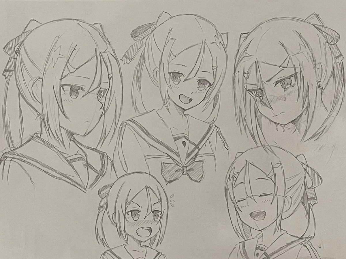 おはみもりん☀️ 昨日はゆゆゆ棚の模様替えをしていたので、今日のぐんちゃんは「ラフ→清書用の線画」だけです ここから線の太さや濃淡を調整するので線画もまだ終わってないけど💦 でもこの状態の線画も好きなんですよね✨ おまけで若葉ちゃんの表情集の線画も笑 #イラスト好きな人と繋がりたい