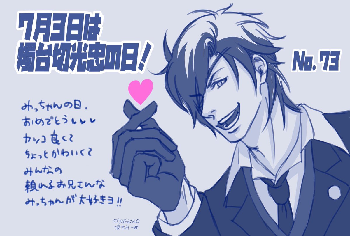 2 17 大遅刻なんですけど、燭台切光忠の日をお祝いするのだ㊗️🎉 今年もヒトの生をたくさん謳歌してね! #7月3日は刀帳番号73燭台切光忠の日 #刀帳no73で7月3日は燭台切光忠の日 20/07/05 00:21