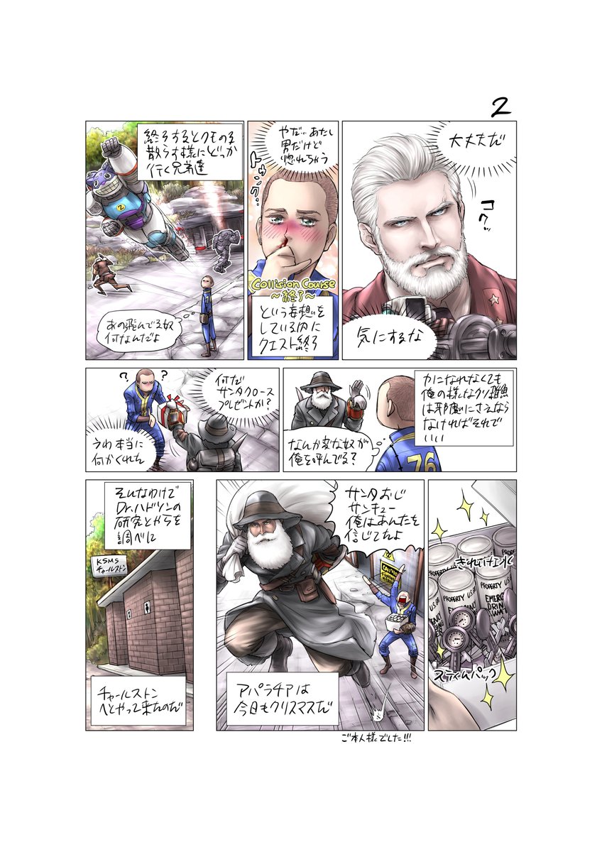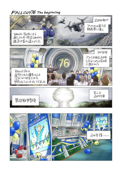 あけおめす。殆ど誰にも挨拶せずすみませんでした。先月から今まで仕事その他過密スケジュールでその隙間時間の大半をこの漫画に充ててtwitterを開く間もなく…今日まさに半分解放されたので、どうぞ皆様今年もよろしく一緒に楽しんで下さい! 自己リプに漫画まだ続きます。 #fallout76