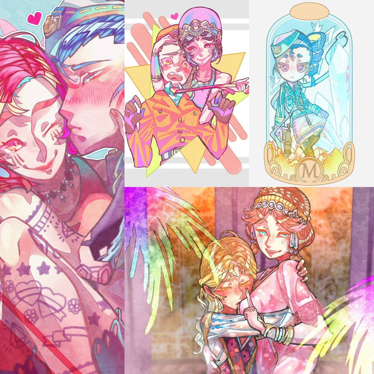 ◆玩具職人/アニー・レスター🧸 :ペーパーウィング ◆血の女王/マリー🪞:女大公 ◆傭兵/ナワーブ・サベダー🤕:砲兵 ◆結魂者/ヴィオレッタ:再造者 第五人格×鎌田光司コラボ衣装ビネット風4種全員完成したので改めて並べてみました!皆大好きです💕 #第五人格イラスト #IdentityVfanart